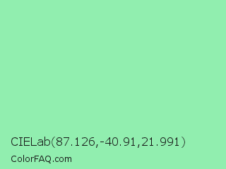 CIELab 87.126,-40.91,21.991 Color is a light green color and the nearest color is Teal Deer #99e6b3. Hex code #91eeaf and RGB value is rgb(145,238,175). In RGB color space, this color is composed of 57% red, 93% green, 69% blue, In CMYK color space, this color is composed of 39% cyan, 0% magenta, 26% yellow , 7% black , In HSL color space, this color has a hue angle of 139° , 73% saturation and 75% lightness.