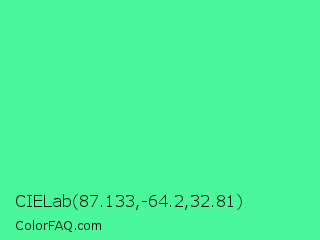 CIELab 87.133,-64.2,32.81 Color is a light green color and the nearest color is Very Light Malachite Green #64e986. Hex code #4af799 and RGB value is rgb(74,247,153). In RGB color space, this color is composed of 29% red, 97% green, 60% blue, In CMYK color space, this color is composed of 70% cyan, 0% magenta, 38% yellow , 3% black , In HSL color space, this color has a hue angle of 147° , 92% saturation and 63% lightness.