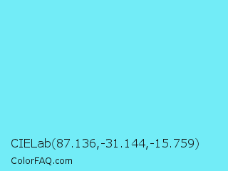 CIELab 87.136,-31.144,-15.759 Color is a light cyan color and the nearest color is Electric Blue #7df9ff. Hex code #72ecf7 and RGB value is rgb(114,236,247). In RGB color space, this color is composed of 45% red, 93% green, 97% blue, In CMYK color space, this color is composed of 54% cyan, 4% magenta, 0% yellow , 3% black , In HSL color space, this color has a hue angle of 185° , 89% saturation and 71% lightness.