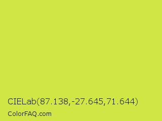 CIELab 87.138,-27.645,71.644 Color is a normal yellow color and the nearest color is Maximum Green Yellow #d9e650. Hex code #cfe645 and RGB value is rgb(207,230,69). In RGB color space, this color is composed of 81% red, 90% green, 27% blue, In CMYK color space, this color is composed of 10% cyan, 0% magenta, 70% yellow , 10% black , In HSL color space, this color has a hue angle of 69° , 76% saturation and 59% lightness.