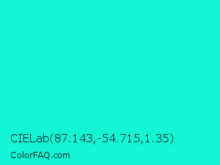 CIELab 87.143,-54.715,1.35 Color is a normal cyan color and the nearest color is Bright Turquoise #08e8de. Hex code #13f5d6 and RGB value is rgb(19,245,214). In RGB color space, this color is composed of 7% red, 96% green, 84% blue, In CMYK color space, this color is composed of 92% cyan, 0% magenta, 13% yellow , 4% black , In HSL color space, this color has a hue angle of 172° , 92% saturation and 52% lightness.