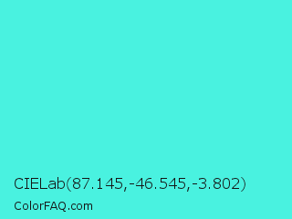 CIELab 87.145,-46.545,-3.802 Color is a light cyan color and the nearest color is Turquoise #40e0d0. Hex code #49f2e0 and RGB value is rgb(73,242,224). In RGB color space, this color is composed of 29% red, 95% green, 88% blue, In CMYK color space, this color is composed of 70% cyan, 0% magenta, 7% yellow , 5% black , In HSL color space, this color has a hue angle of 174° , 87% saturation and 62% lightness.