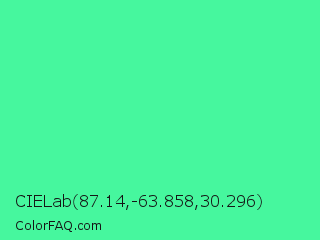 CIELab 87.14,-63.858,30.296 Color is a light green color and the nearest color is Eucalyptus #44d7a8. Hex code #46f79e and RGB value is rgb(70,247,158). In RGB color space, this color is composed of 27% red, 97% green, 62% blue, In CMYK color space, this color is composed of 72% cyan, 0% magenta, 36% yellow , 3% black , In HSL color space, this color has a hue angle of 150° , 92% saturation and 62% lightness.