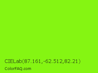 CIELab 87.161,-62.512,82.21 Color is a normal green color and the nearest color is Lawn Green #7cfc00. Hex code #85f512 and RGB value is rgb(133,245,18). In RGB color space, this color is composed of 52% red, 96% green, 7% blue, In CMYK color space, this color is composed of 46% cyan, 0% magenta, 93% yellow , 4% black , In HSL color space, this color has a hue angle of 90° , 92% saturation and 52% lightness.