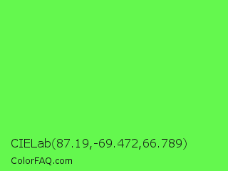 CIELab 87.19,-69.472,66.789 Color is a light green color and the nearest color is Screamin Green #66ff66. Hex code #64f84e and RGB value is rgb(100,248,78). In RGB color space, this color is composed of 39% red, 97% green, 31% blue, In CMYK color space, this color is composed of 60% cyan, 0% magenta, 69% yellow , 3% black , In HSL color space, this color has a hue angle of 112° , 92% saturation and 64% lightness.