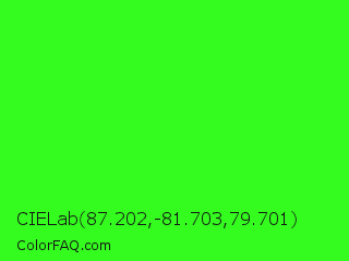 CIELab 87.202,-81.703,79.701 Color is a normal green color and the nearest color is Neon Green #39ff14. Hex code #33fc1e and RGB value is rgb(51,252,30). In RGB color space, this color is composed of 20% red, 99% green, 12% blue, In CMYK color space, this color is composed of 80% cyan, 0% magenta, 88% yellow , 1% black , In HSL color space, this color has a hue angle of 114° , 97% saturation and 55% lightness.