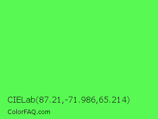CIELab 87.21,-71.986,65.214 Color is a light green color and the nearest color is Screamin Green #66ff66. Hex code #58f952 and RGB value is rgb(88,249,82). In RGB color space, this color is composed of 35% red, 98% green, 32% blue, In CMYK color space, this color is composed of 65% cyan, 0% magenta, 67% yellow , 2% black , In HSL color space, this color has a hue angle of 118° , 93% saturation and 65% lightness.