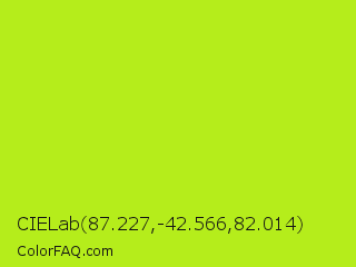 CIELab 87.227,-42.566,82.014 Color is a normal lime color and the nearest color is Inch Worm #b0e313. Hex code #b5ed1b and RGB value is rgb(181,237,27). In RGB color space, this color is composed of 71% red, 93% green, 11% blue, In CMYK color space, this color is composed of 24% cyan, 0% magenta, 89% yellow , 7% black , In HSL color space, this color has a hue angle of 76° , 85% saturation and 52% lightness.