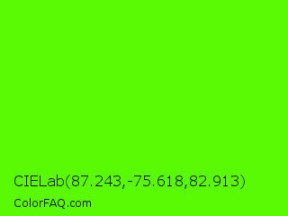 CIELab 87.243,-75.618,82.913 Color is a normal green color and the nearest color is Bright Green #66ff00. Hex code #59fa04 and RGB value is rgb(89,250,4). In RGB color space, this color is composed of 35% red, 98% green, 2% blue, In CMYK color space, this color is composed of 64% cyan, 0% magenta, 98% yellow , 2% black , In HSL color space, this color has a hue angle of 99° , 97% saturation and 50% lightness.