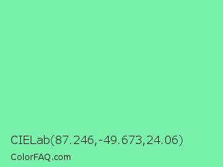 CIELab 87.246,-49.673,24.06 Color is a light green color and the nearest color is Medium Aquamarine #66ddaa. Hex code #79f2ab and RGB value is rgb(121,242,171). In RGB color space, this color is composed of 47% red, 95% green, 67% blue, In CMYK color space, this color is composed of 50% cyan, 0% magenta, 29% yellow , 5% black , In HSL color space, this color has a hue angle of 145° , 82% saturation and 71% lightness.
