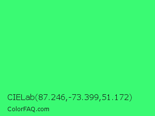 CIELab 87.246,-73.399,51.172 Color is a normal green color and the nearest color is UFO Green #3cd070. Hex code #3afa73 and RGB value is rgb(58,250,115). In RGB color space, this color is composed of 23% red, 98% green, 45% blue, In CMYK color space, this color is composed of 77% cyan, 0% magenta, 54% yellow , 2% black , In HSL color space, this color has a hue angle of 138° , 95% saturation and 60% lightness.