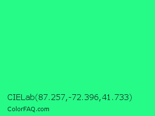 CIELab 87.257,-72.396,41.733 Color is a normal green color and the nearest color is Spring Green #00ff7f. Hex code #26fa87 and RGB value is rgb(38,250,135). In RGB color space, this color is composed of 15% red, 98% green, 53% blue, In CMYK color space, this color is composed of 85% cyan, 0% magenta, 46% yellow , 2% black , In HSL color space, this color has a hue angle of 147° , 95% saturation and 56% lightness.