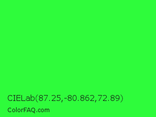 CIELab 87.25,-80.862,72.89 Color is a normal green color and the nearest color is Neon Green #39ff14. Hex code #2efc3b and RGB value is rgb(46,252,59). In RGB color space, this color is composed of 18% red, 99% green, 23% blue, In CMYK color space, this color is composed of 82% cyan, 0% magenta, 77% yellow , 1% black , In HSL color space, this color has a hue angle of 124° , 97% saturation and 58% lightness.