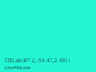 CIELab 87.2,-54.47,2.491 Color is a normal cyan color and the nearest color is Bright Turquoise #08e8de. Hex code #23f5d4 and RGB value is rgb(35,245,212). In RGB color space, this color is composed of 14% red, 96% green, 83% blue, In CMYK color space, this color is composed of 86% cyan, 0% magenta, 13% yellow , 4% black , In HSL color space, this color has a hue angle of 171° , 91% saturation and 55% lightness.
