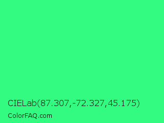 CIELab 87.307,-72.327,45.175 Color is a normal green color and the nearest color is UFO Green #3cd070. Hex code #33fa80 and RGB value is rgb(51,250,128). In RGB color space, this color is composed of 20% red, 98% green, 50% blue, In CMYK color space, this color is composed of 80% cyan, 0% magenta, 49% yellow , 2% black , In HSL color space, this color has a hue angle of 143° , 95% saturation and 59% lightness.
