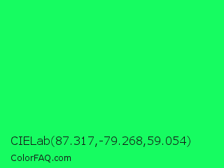 CIELab 87.317,-79.268,59.054 Color is a normal green color and the nearest color is Spring Green #00ff7f. Hex code #16fc61 and RGB value is rgb(22,252,97). In RGB color space, this color is composed of 9% red, 99% green, 38% blue, In CMYK color space, this color is composed of 91% cyan, 0% magenta, 62% yellow , 1% black , In HSL color space, this color has a hue angle of 140° , 97% saturation and 54% lightness.