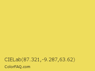 CIELab 87.321,-9.287,63.62 Color is a light yellow color and the nearest color is Confetti #e9d75a. Hex code #eedd5c and RGB value is rgb(238,221,92). In RGB color space, this color is composed of 93% red, 87% green, 36% blue, In CMYK color space, this color is composed of 0% cyan, 7% magenta, 61% yellow , 7% black , In HSL color space, this color has a hue angle of 53° , 81% saturation and 65% lightness.