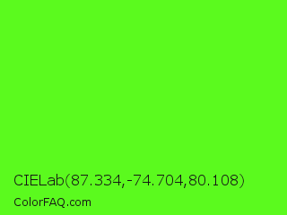 CIELab 87.334,-74.704,80.108 Color is a normal green color and the nearest color is Bright Green #66ff00. Hex code #5bfa1e and RGB value is rgb(91,250,30). In RGB color space, this color is composed of 36% red, 98% green, 12% blue, In CMYK color space, this color is composed of 64% cyan, 0% magenta, 88% yellow , 2% black , In HSL color space, this color has a hue angle of 103° , 96% saturation and 55% lightness.