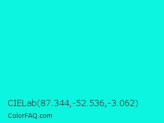 CIELab 87.344,-52.536,-3.062 Color is a normal cyan color and the nearest color is Bright Turquoise #08e8de. Hex code #0cf5df and RGB value is rgb(12,245,223). In RGB color space, this color is composed of 5% red, 96% green, 87% blue, In CMYK color space, this color is composed of 95% cyan, 0% magenta, 9% yellow , 4% black , In HSL color space, this color has a hue angle of 174° , 92% saturation and 50% lightness.