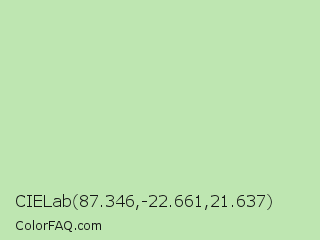 CIELab 87.346,-22.661,21.637 Color is a light green color and the nearest color is Pixie Green #c0d8b6. Hex code #bee6b1 and RGB value is rgb(190,230,177). In RGB color space, this color is composed of 75% red, 90% green, 69% blue, In CMYK color space, this color is composed of 17% cyan, 0% magenta, 23% yellow , 10% black , In HSL color space, this color has a hue angle of 105° , 51% saturation and 80% lightness.