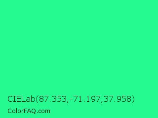 CIELab 87.353,-71.197,37.958 Color is a normal green color and the nearest color is Medium Spring Green #00fa9a. Hex code #24fa8f and RGB value is rgb(36,250,143). In RGB color space, this color is composed of 14% red, 98% green, 56% blue, In CMYK color space, this color is composed of 86% cyan, 0% magenta, 43% yellow , 2% black , In HSL color space, this color has a hue angle of 150° , 96% saturation and 56% lightness.