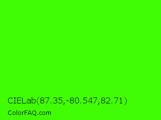 CIELab 87.35,-80.547,82.71 Color is a normal green color and the nearest color is Harlequin #3fff00. Hex code #40fc05 and RGB value is rgb(64,252,5). In RGB color space, this color is composed of 25% red, 99% green, 2% blue, In CMYK color space, this color is composed of 75% cyan, 0% magenta, 98% yellow , 1% black , In HSL color space, this color has a hue angle of 106° , 98% saturation and 50% lightness.