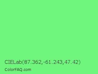 CIELab 87.362,-61.243,47.42 Color is a light green color and the nearest color is Very Light Malachite Green #64e986. Hex code #6ff67c and RGB value is rgb(111,246,124). In RGB color space, this color is composed of 44% red, 96% green, 49% blue, In CMYK color space, this color is composed of 55% cyan, 0% magenta, 50% yellow , 4% black , In HSL color space, this color has a hue angle of 126° , 88% saturation and 70% lightness.