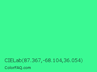 CIELab 87.367,-68.104,36.054 Color is a normal green color and the nearest color is Eucalyptus #44d7a8. Hex code #3af993 and RGB value is rgb(58,249,147). In RGB color space, this color is composed of 23% red, 98% green, 58% blue, In CMYK color space, this color is composed of 77% cyan, 0% magenta, 41% yellow , 2% black , In HSL color space, this color has a hue angle of 148° , 94% saturation and 60% lightness.
