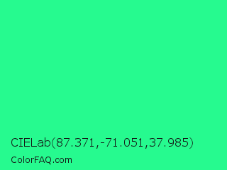 CIELab 87.371,-71.051,37.985 Color is a normal green color and the nearest color is Medium Spring Green #00fa9a. Hex code #26fa8f and RGB value is rgb(38,250,143). In RGB color space, this color is composed of 15% red, 98% green, 56% blue, In CMYK color space, this color is composed of 85% cyan, 0% magenta, 43% yellow , 2% black , In HSL color space, this color has a hue angle of 150° , 95% saturation and 56% lightness.