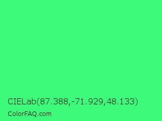 CIELab 87.388,-71.929,48.133 Color is a light green color and the nearest color is UFO Green #3cd070. Hex code #3efa7a and RGB value is rgb(62,250,122). In RGB color space, this color is composed of 24% red, 98% green, 48% blue, In CMYK color space, this color is composed of 75% cyan, 0% magenta, 51% yellow , 2% black , In HSL color space, this color has a hue angle of 139° , 95% saturation and 61% lightness.