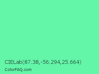 CIELab 87.38,-56.294,25.664 Color is a light green color and the nearest color is Medium Aquamarine #66ddaa. Hex code #63f5a8 and RGB value is rgb(99,245,168). In RGB color space, this color is composed of 39% red, 96% green, 66% blue, In CMYK color space, this color is composed of 60% cyan, 0% magenta, 31% yellow , 4% black , In HSL color space, this color has a hue angle of 148° , 88% saturation and 67% lightness.