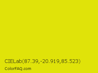 CIELab 87.39,-20.919,85.523 Color is a normal yellow color and the nearest color is Peridot #e6e200. Hex code #e0e309 and RGB value is rgb(224,227,9). In RGB color space, this color is composed of 88% red, 89% green, 4% blue, In CMYK color space, this color is composed of 1% cyan, 0% magenta, 96% yellow , 11% black , In HSL color space, this color has a hue angle of 61° , 92% saturation and 46% lightness.