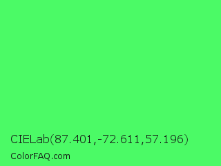 CIELab 87.401,-72.611,57.196 Color is a light green color and the nearest color is Screamin Green #66ff66. Hex code #4bfa66 and RGB value is rgb(75,250,102). In RGB color space, this color is composed of 29% red, 98% green, 40% blue, In CMYK color space, this color is composed of 70% cyan, 0% magenta, 59% yellow , 2% black , In HSL color space, this color has a hue angle of 129° , 95% saturation and 64% lightness.