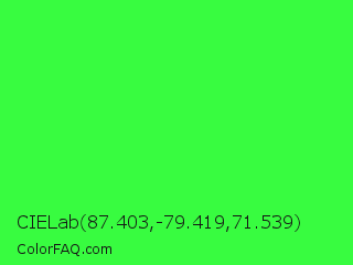 CIELab 87.403,-79.419,71.539 Color is a normal green color and the nearest color is Neon Green #39ff14. Hex code #38fc40 and RGB value is rgb(56,252,64). In RGB color space, this color is composed of 22% red, 99% green, 25% blue, In CMYK color space, this color is composed of 78% cyan, 0% magenta, 75% yellow , 1% black , In HSL color space, this color has a hue angle of 122° , 97% saturation and 60% lightness.