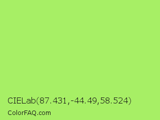 CIELab 87.431,-44.49,58.524 Color is a light green color and the nearest color is Inchworm #b2ec5d. Hex code #a7ef65 and RGB value is rgb(167,239,101). In RGB color space, this color is composed of 65% red, 94% green, 40% blue, In CMYK color space, this color is composed of 30% cyan, 0% magenta, 58% yellow , 6% black , In HSL color space, this color has a hue angle of 91° , 81% saturation and 67% lightness.
