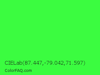 CIELab 87.447,-79.042,71.597 Color is a light green color and the nearest color is Neon Green #39ff14. Hex code #3bfc40 and RGB value is rgb(59,252,64). In RGB color space, this color is composed of 23% red, 99% green, 25% blue, In CMYK color space, this color is composed of 77% cyan, 0% magenta, 75% yellow , 1% black , In HSL color space, this color has a hue angle of 122° , 97% saturation and 61% lightness.