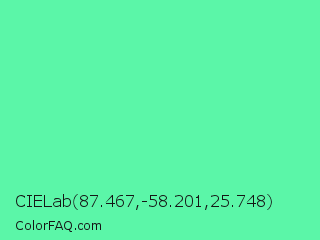 CIELab 87.467,-58.201,25.748 Color is a light green color and the nearest color is Medium Aquamarine #66ddaa. Hex code #5bf6a8 and RGB value is rgb(91,246,168). In RGB color space, this color is composed of 36% red, 96% green, 66% blue, In CMYK color space, this color is composed of 63% cyan, 0% magenta, 32% yellow , 4% black , In HSL color space, this color has a hue angle of 150° , 90% saturation and 66% lightness.