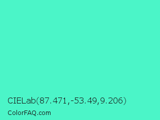 CIELab 87.471,-53.49,9.206 Color is a light cyan color and the nearest color is Turquoise #40e0d0. Hex code #4bf5c8 and RGB value is rgb(75,245,200). In RGB color space, this color is composed of 29% red, 96% green, 78% blue, In CMYK color space, this color is composed of 69% cyan, 0% magenta, 18% yellow , 4% black , In HSL color space, this color has a hue angle of 164° , 89% saturation and 63% lightness.
