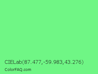 CIELab 87.477,-59.983,43.276 Color is a light green color and the nearest color is Very Light Malachite Green #64e986. Hex code #6ff685 and RGB value is rgb(111,246,133). In RGB color space, this color is composed of 44% red, 96% green, 52% blue, In CMYK color space, this color is composed of 55% cyan, 0% magenta, 46% yellow , 4% black , In HSL color space, this color has a hue angle of 130° , 88% saturation and 70% lightness.