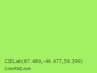 CIELab 87.489,-46.477,59.399 Color is a light green color and the nearest color is Inchworm #b2ec5d. Hex code #a3f063 and RGB value is rgb(163,240,99). In RGB color space, this color is composed of 64% red, 94% green, 39% blue, In CMYK color space, this color is composed of 32% cyan, 0% magenta, 59% yellow , 6% black , In HSL color space, this color has a hue angle of 93° , 82% saturation and 66% lightness.