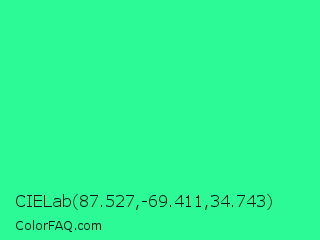CIELab 87.527,-69.411,34.743 Color is a normal green color and the nearest color is Medium Spring Green #00fa9a. Hex code #2bfa96 and RGB value is rgb(43,250,150). In RGB color space, this color is composed of 17% red, 98% green, 59% blue, In CMYK color space, this color is composed of 83% cyan, 0% magenta, 40% yellow , 2% black , In HSL color space, this color has a hue angle of 151° , 95% saturation and 57% lightness.