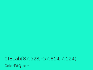 CIELab 87.528,-57.814,7.124 Color is a normal cyan color and the nearest color is Bright Turquoise #08e8de. Hex code #19f7cc and RGB value is rgb(25,247,204). In RGB color space, this color is composed of 10% red, 97% green, 80% blue, In CMYK color space, this color is composed of 90% cyan, 0% magenta, 17% yellow , 3% black , In HSL color space, this color has a hue angle of 168° , 93% saturation and 53% lightness.