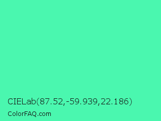 CIELab 87.52,-59.939,22.186 Color is a light green color and the nearest color is Eucalyptus #44d7a8. Hex code #4af7af and RGB value is rgb(74,247,175). In RGB color space, this color is composed of 29% red, 97% green, 69% blue, In CMYK color space, this color is composed of 70% cyan, 0% magenta, 29% yellow , 3% black , In HSL color space, this color has a hue angle of 155° , 92% saturation and 63% lightness.