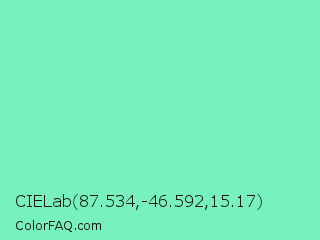 CIELab 87.534,-46.592,15.17 Color is a light green color and the nearest color is Aquamarine #7fffd4. Hex code #77f2bd and RGB value is rgb(119,242,189). In RGB color space, this color is composed of 47% red, 95% green, 74% blue, In CMYK color space, this color is composed of 51% cyan, 0% magenta, 22% yellow , 5% black , In HSL color space, this color has a hue angle of 154° , 83% saturation and 71% lightness.
