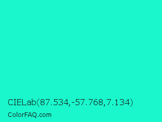 CIELab 87.534,-57.768,7.134 Color is a normal cyan color and the nearest color is Bright Turquoise #08e8de. Hex code #1af7cc and RGB value is rgb(26,247,204). In RGB color space, this color is composed of 10% red, 97% green, 80% blue, In CMYK color space, this color is composed of 89% cyan, 0% magenta, 17% yellow , 3% black , In HSL color space, this color has a hue angle of 168° , 93% saturation and 54% lightness.