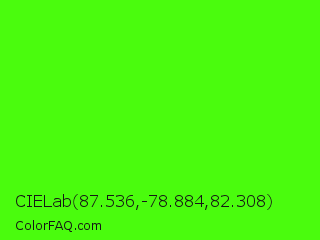 CIELab 87.536,-78.884,82.308 Color is a normal green color and the nearest color is Chlorophyll Green #4aff00. Hex code #4afc0d and RGB value is rgb(74,252,13). In RGB color space, this color is composed of 29% red, 99% green, 5% blue, In CMYK color space, this color is composed of 71% cyan, 0% magenta, 95% yellow , 1% black , In HSL color space, this color has a hue angle of 105° , 98% saturation and 52% lightness.