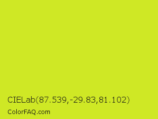 CIELab 87.539,-29.83,81.102 Color is a normal yellow color and the nearest color is Pear #d1e231. Hex code #cfe825 and RGB value is rgb(207,232,37). In RGB color space, this color is composed of 81% red, 91% green, 15% blue, In CMYK color space, this color is composed of 11% cyan, 0% magenta, 84% yellow , 9% black , In HSL color space, this color has a hue angle of 68° , 81% saturation and 53% lightness.