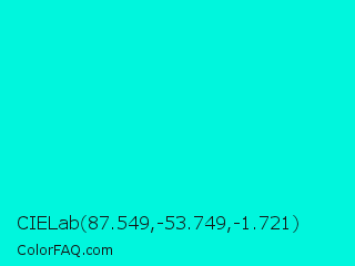 CIELab 87.549,-53.749,-1.721 Color is a normal cyan color and the nearest color is Bright Turquoise #08e8de. Hex code #00f6dd and RGB value is rgb(0,246,221). In RGB color space, this color is composed of 0% red, 96% green, 87% blue, In CMYK color space, this color is composed of 100% cyan, 0% magenta, 10% yellow , 4% black , In HSL color space, this color has a hue angle of 174° , 100% saturation and 48% lightness.