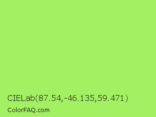 CIELab 87.54,-46.135,59.471 Color is a light green color and the nearest color is Inchworm #b2ec5d. Hex code #a4f063 and RGB value is rgb(164,240,99). In RGB color space, this color is composed of 64% red, 94% green, 39% blue, In CMYK color space, this color is composed of 32% cyan, 0% magenta, 59% yellow , 6% black , In HSL color space, this color has a hue angle of 92° , 82% saturation and 66% lightness.
