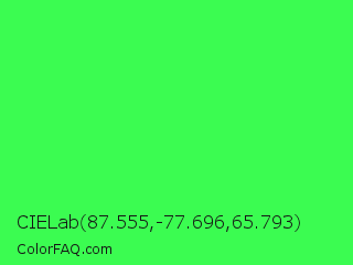 CIELab 87.555,-77.696,65.793 Color is a light green color and the nearest color is Screamin Green #66ff66. Hex code #3bfc51 and RGB value is rgb(59,252,81). In RGB color space, this color is composed of 23% red, 99% green, 32% blue, In CMYK color space, this color is composed of 77% cyan, 0% magenta, 68% yellow , 1% black , In HSL color space, this color has a hue angle of 127° , 97% saturation and 61% lightness.